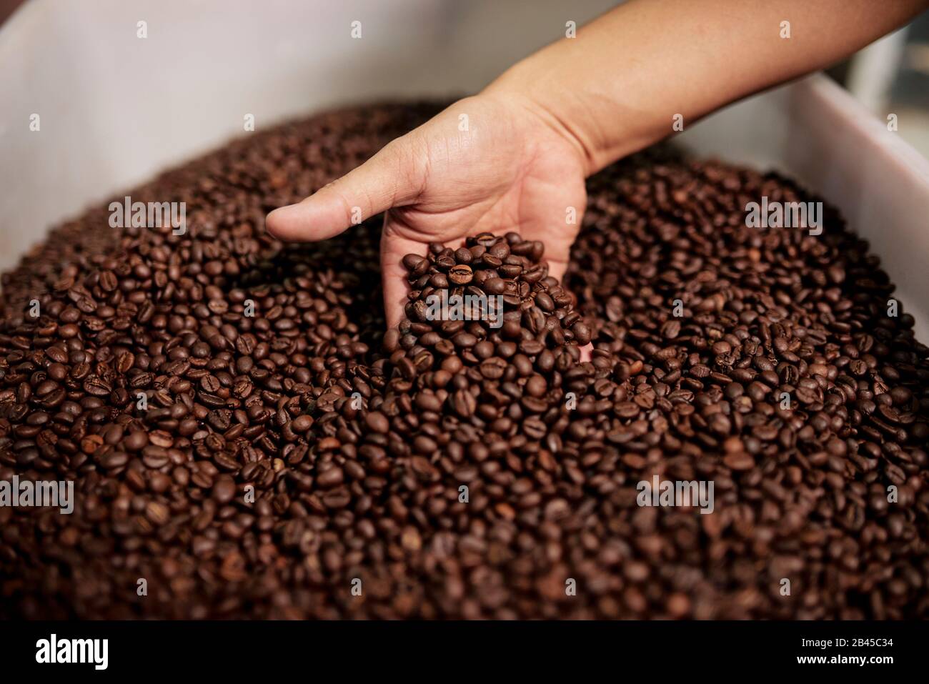 Mano De Persona Mezclando Granos De Cafe Asados En Un Recipiente