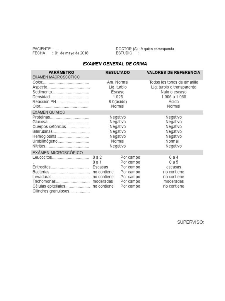 Apenas como ejemplo lo que sigue abajo es un modelo de cómo los laboratorios presentan los resultados del examen sumario de orina. Ver más ideas sobre examenes de laboratorio orina examen. El laboratorio debe proporcionar estos valores junto con el resultado del estudio.